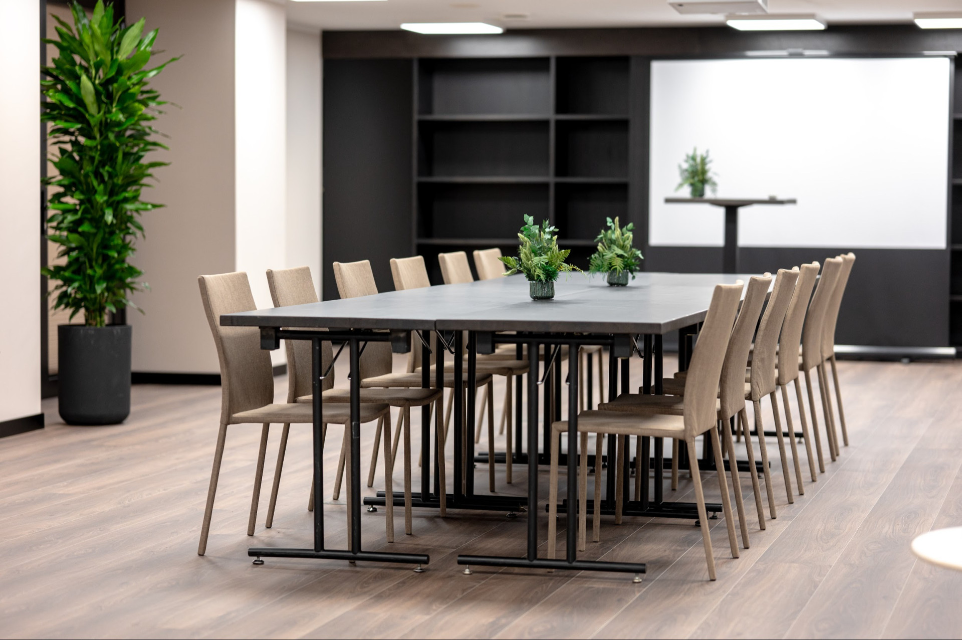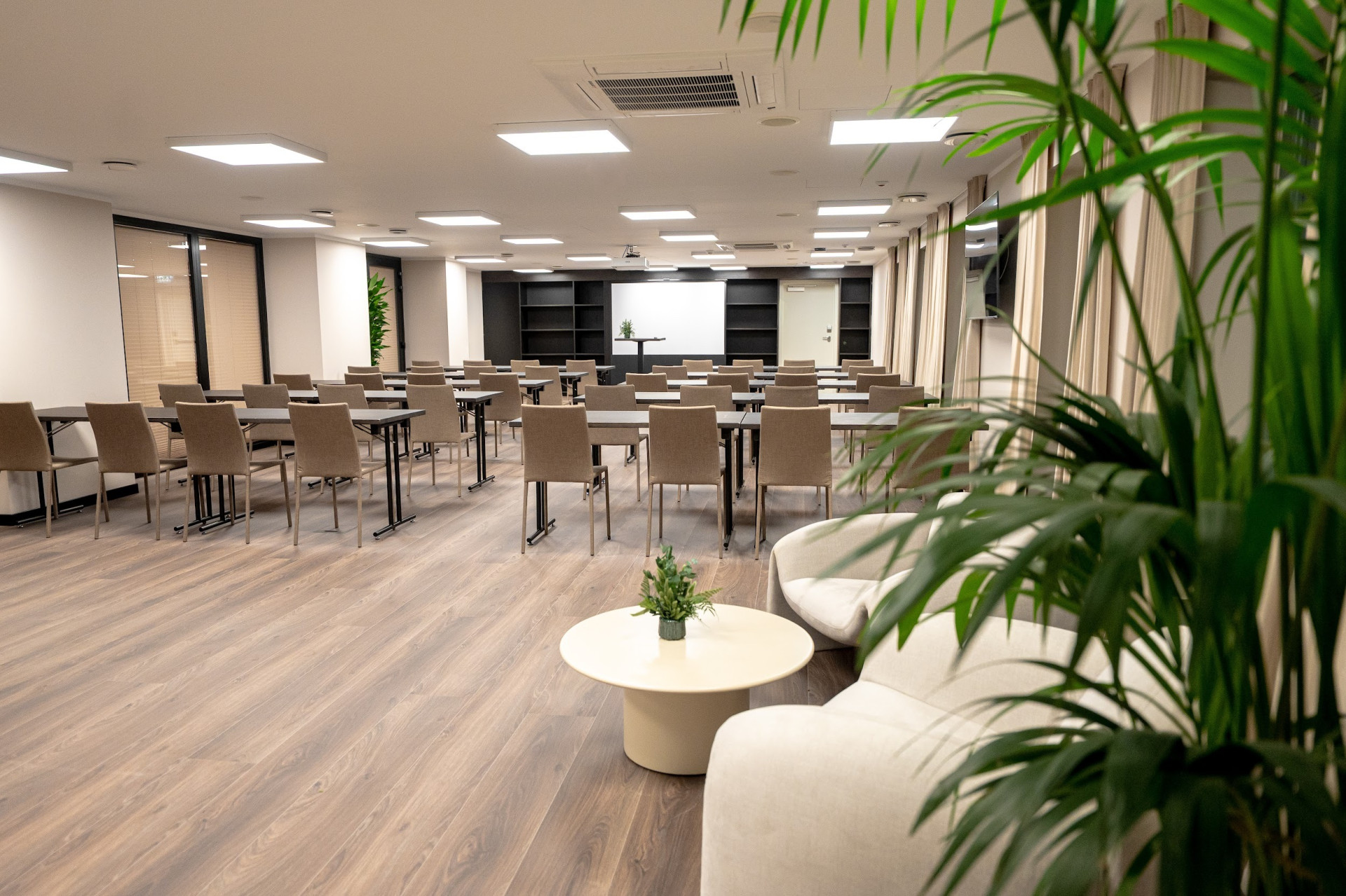 Airconditioned, soundproof, with daylight, latest audiovisual equipment, WIFI, flipchart, High resolution large size 75 inch HD display, phone, DVD player. Support and coaching of an Event Manager is available to help make your event a success.