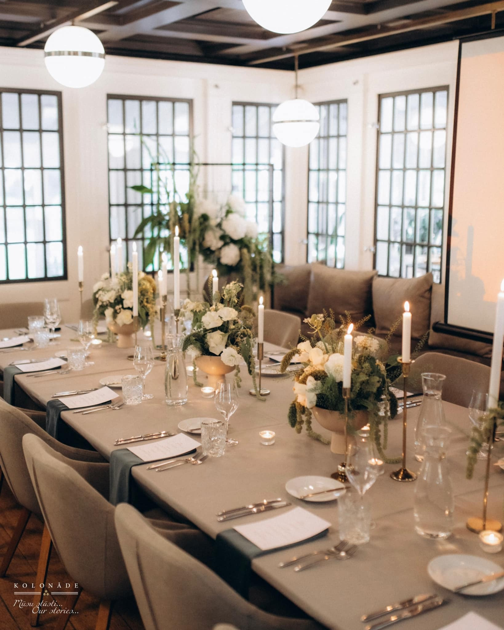 The interior of Kolonāde changes harmoniously with the light of day – elegant and airy during the day, transforming into a romantically refined setting in the evening. This makes the venue ideal for celebratory dinners, weddings, corporate events, presentations and private gatherings.