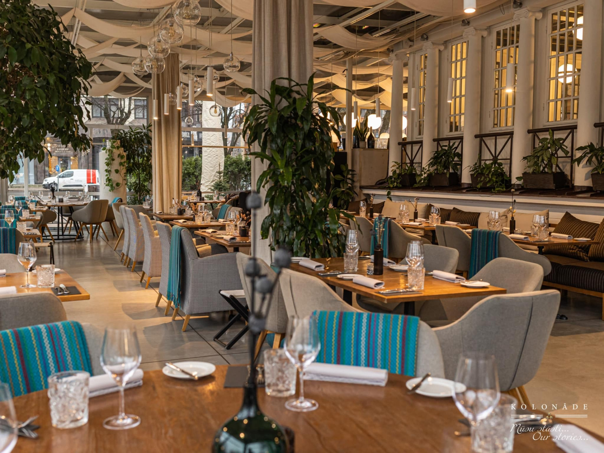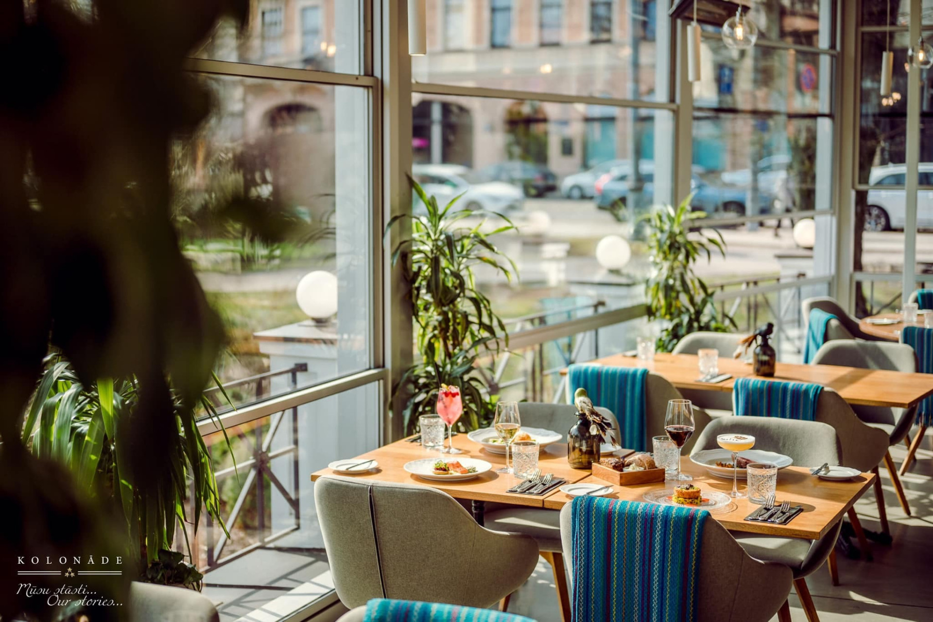 Restaurant Kolonāde. Our Stories is located in one of the most iconic and beautiful areas of Riga – between the Freedom Monument, the Latvian National Opera and Laima Clock, surrounded by a historic city park. The glass-enclosed terrace offers stunning views of the city centre throughout all seasons, creating a special atmosphere for both daytime and evening events.