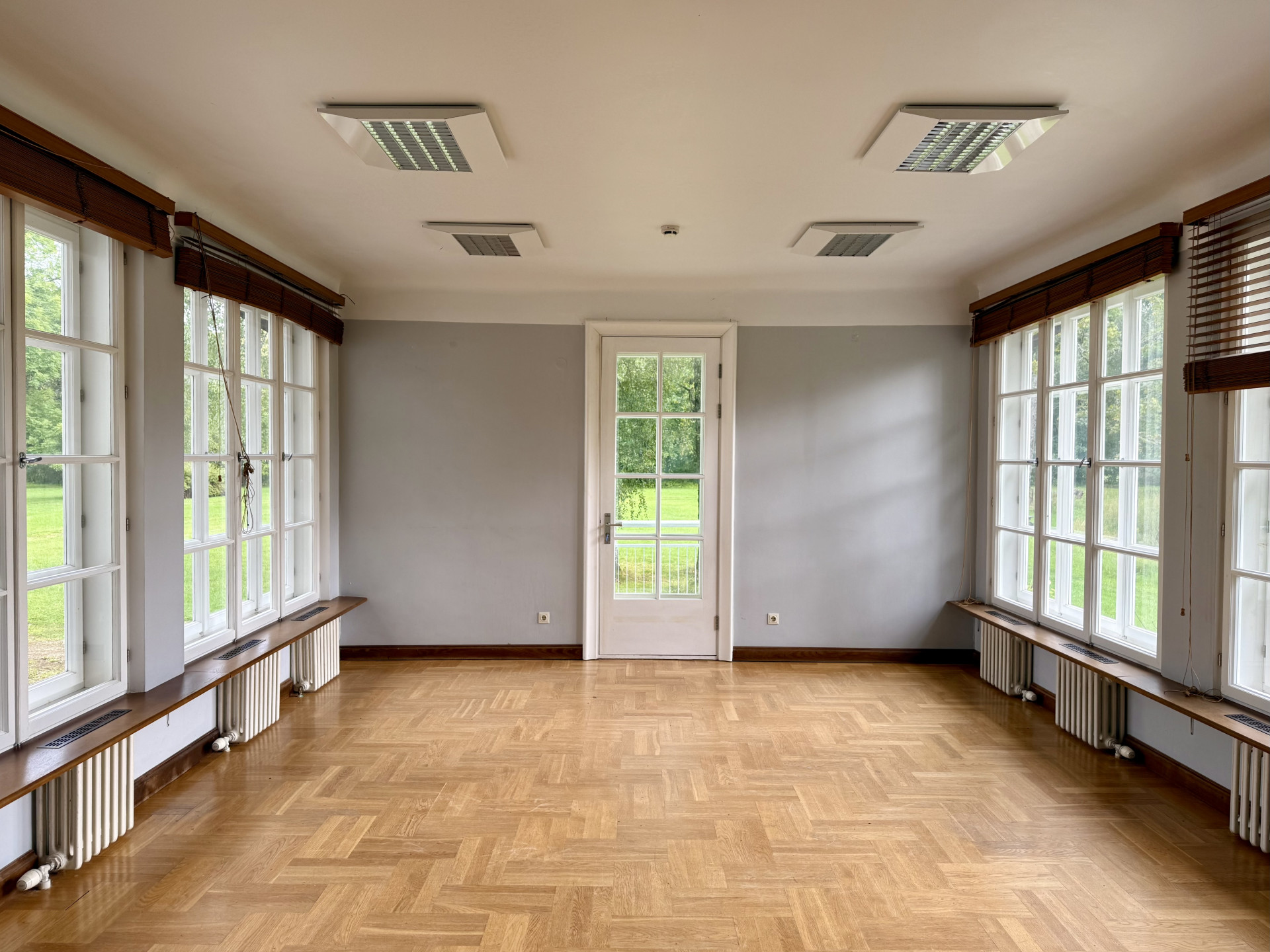 The Small Hall in the Manor House is located on the ground floor of the building and consists of two interconnected rooms, one of which is a bright, glass-enclosed veranda.