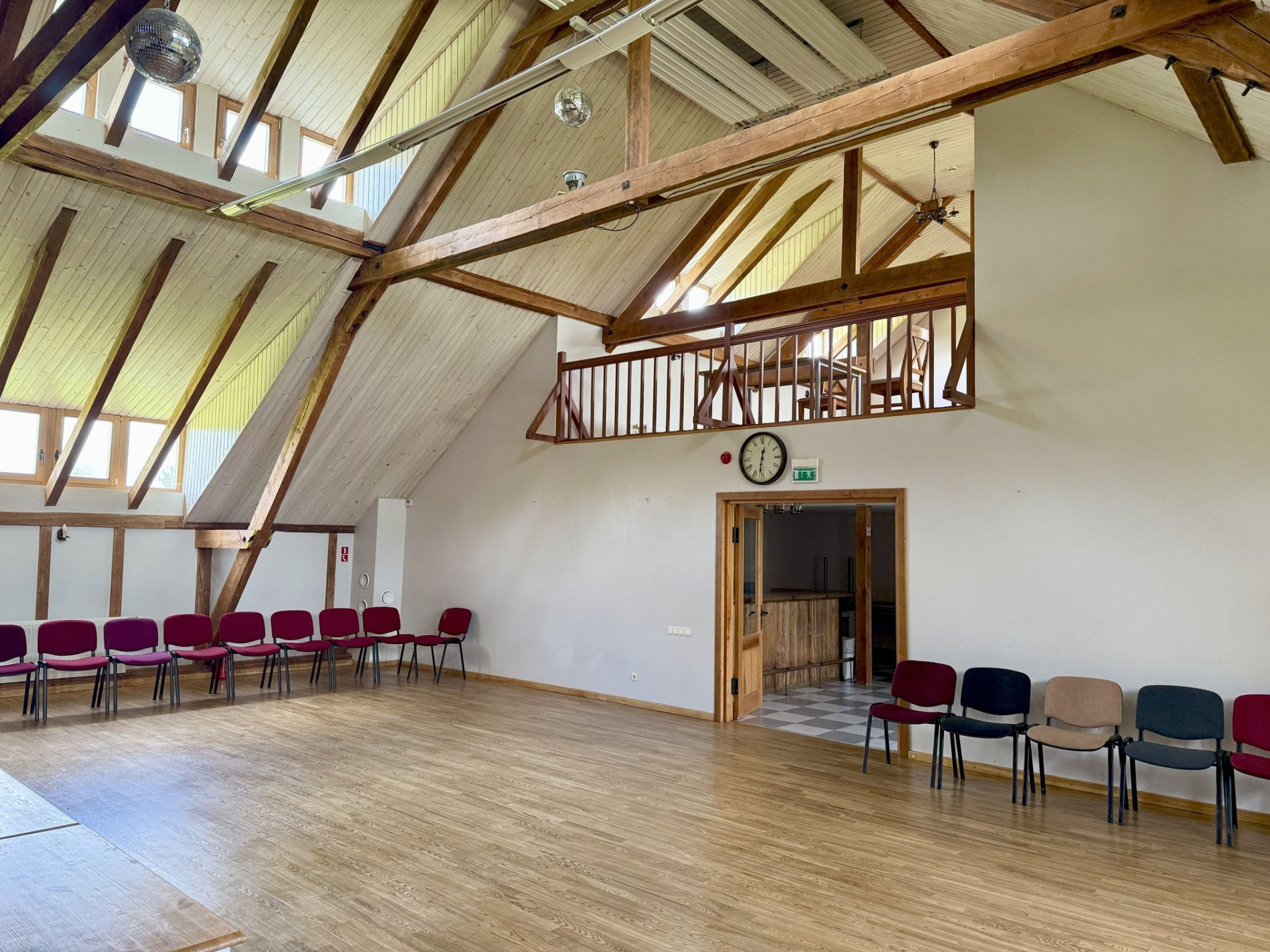 The hall covers an area of 400 m² and features high ceilings, creating a spacious and open atmosphere. At the front of the hall, there is a small stage of approximately 25 m² with a height of 0.5 m, suitable for performances, presentations, and speeches.