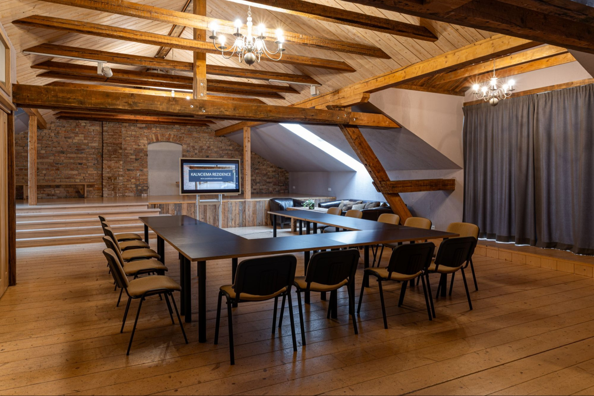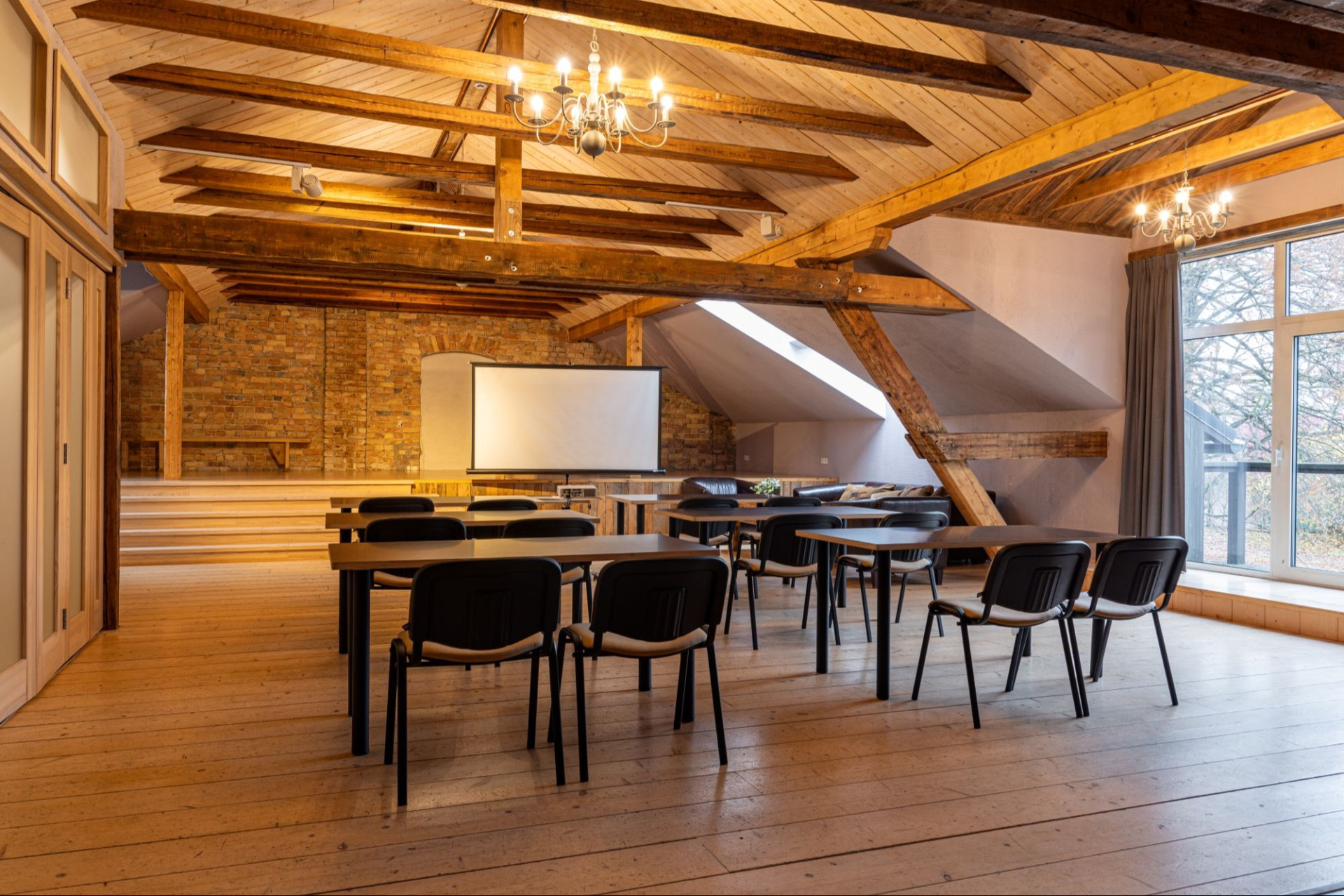 Telpās ir dabiskais apgaismojums, bezvadu internets, projektors, ekrāns, mūzikas atskaņošanas iekārta, pēc pieprasījuma iespējams nodrošināt tējas/kafijas pauzes un uzkodas.