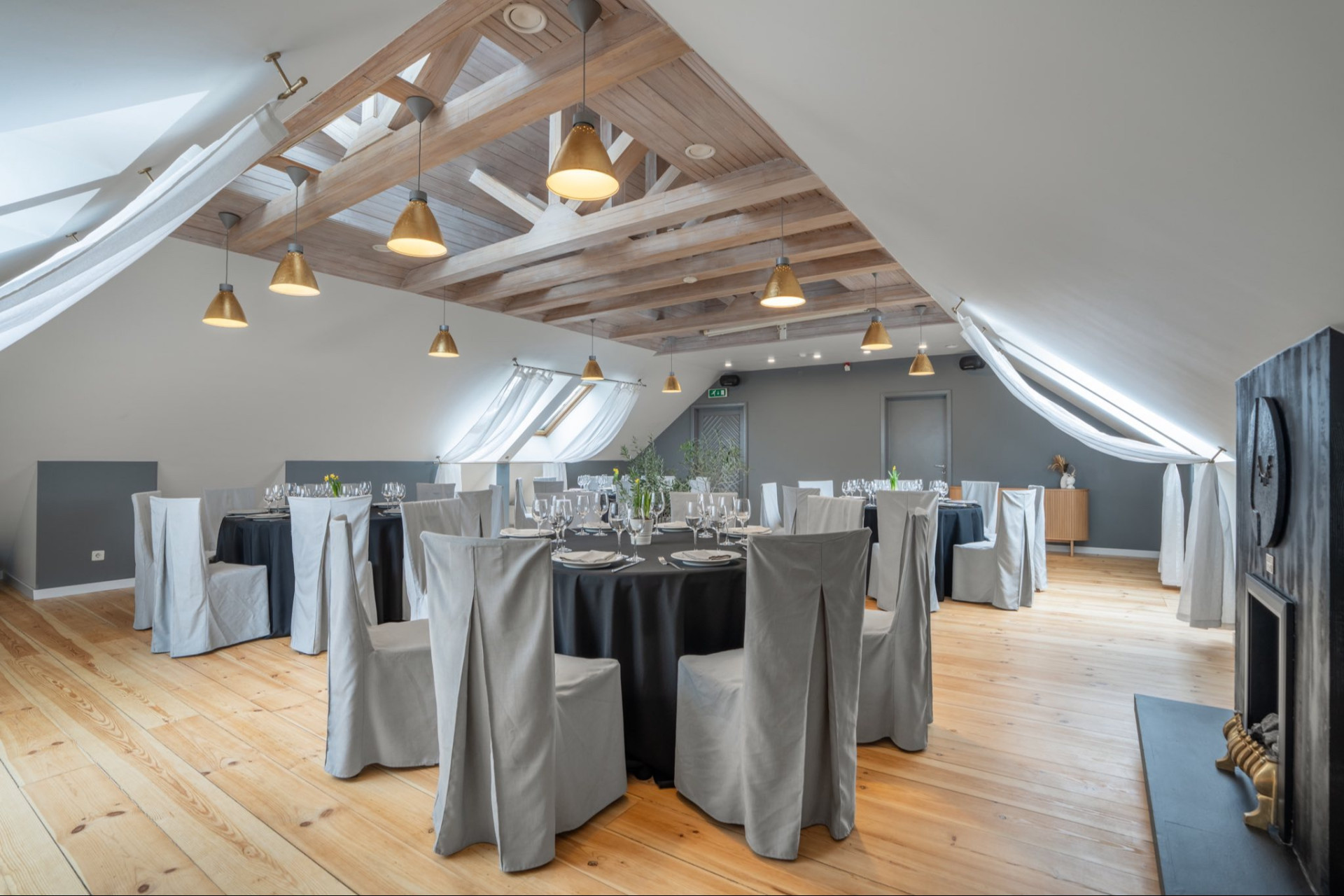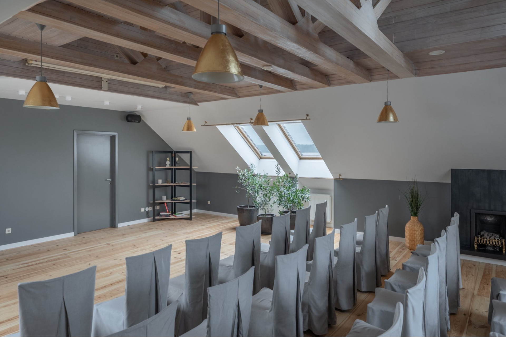 Pirmā stāva zāle piedāvā modernu, mājīgu interjeru, kas spēj uzņemt līdz 50 viesu. |