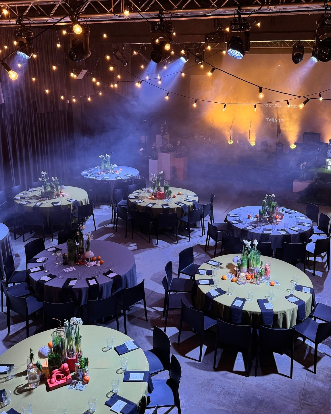 - В зале площадью 175 м2 находится декорированная сцена, фото уголок, в наличии стулья, круглые столы, коктейльные столы и место для фуршета;