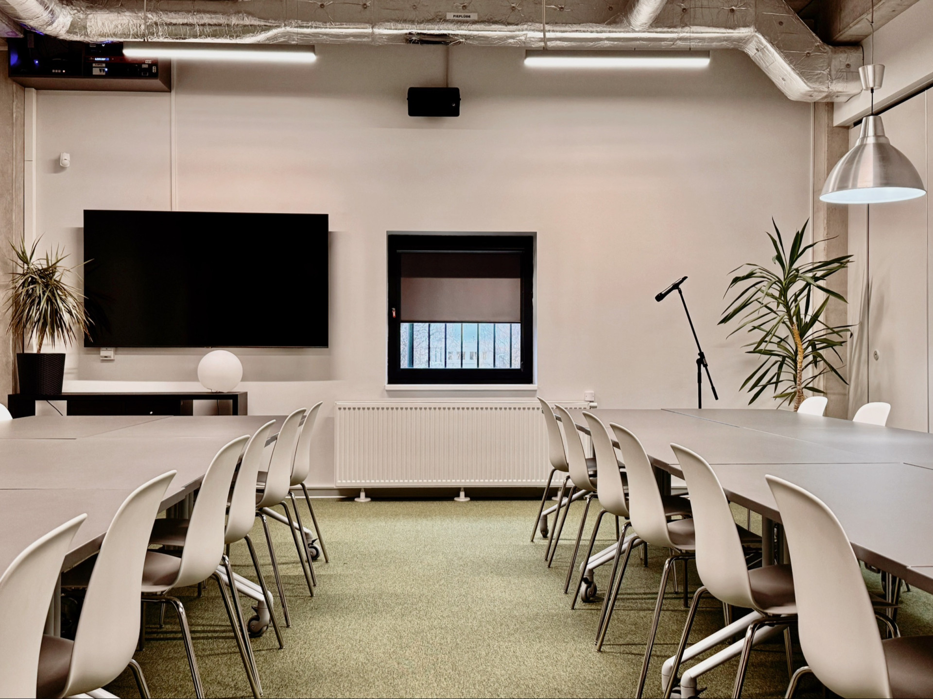 Подходит для встреч, семинаров и тренингов среднего размера до 77 человек. Помещение оснащено всем необходимым оборудованием.
