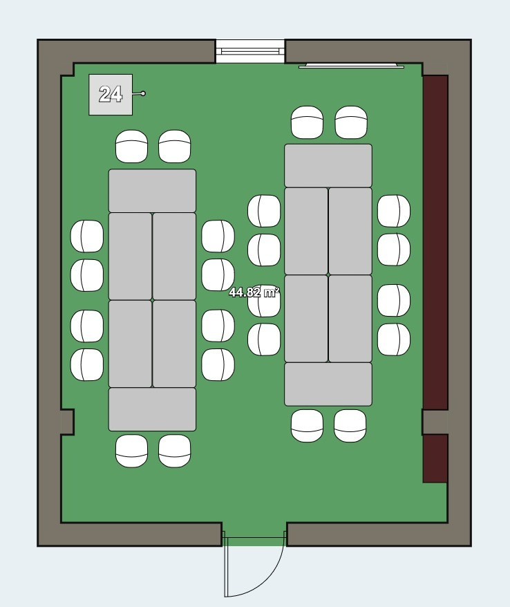 Помещение идеально подходит для небольших встреч, частных мероприятий и командных тренингов до 24 человек. Уютная и функционально обустроенная обстановка оснащена всем необходимым для проведения качественных и продуктивных встреч, позволяя сосредоточиться на самых важных рабочих вопросах и целях.