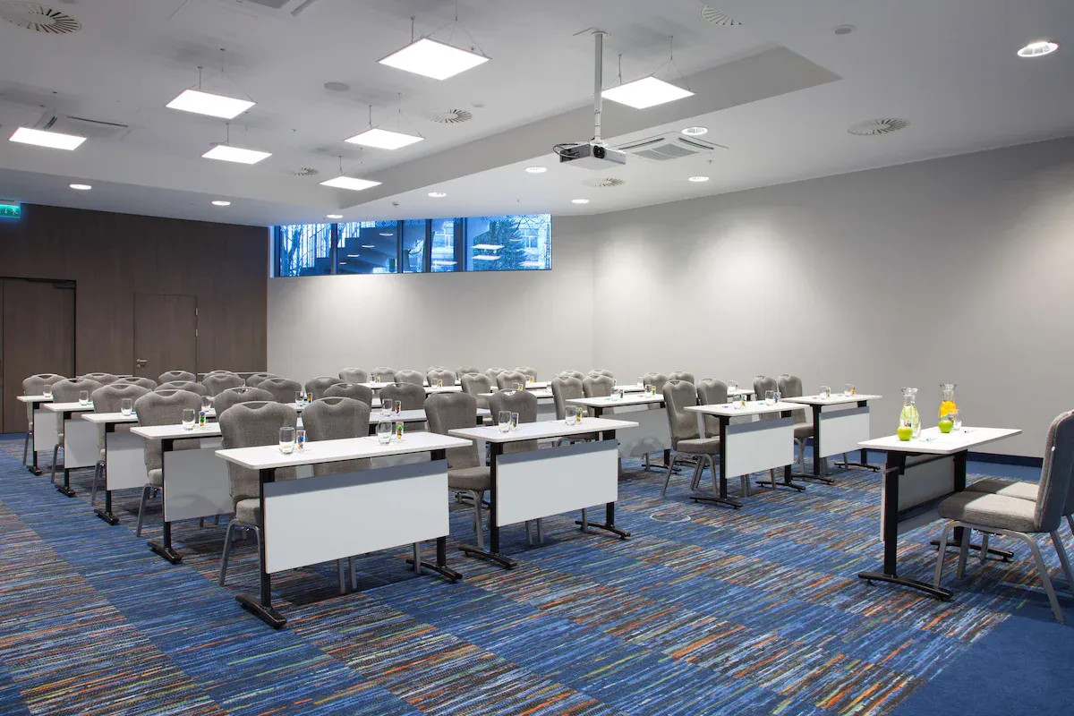 Просторный зал для мероприятий А оснащен флипчартом, проектором, экраном, осветительным и звуковым оборудованием, бумагой, ручками и бесплатным высокоскоростным Wi-Fi для всех участников.