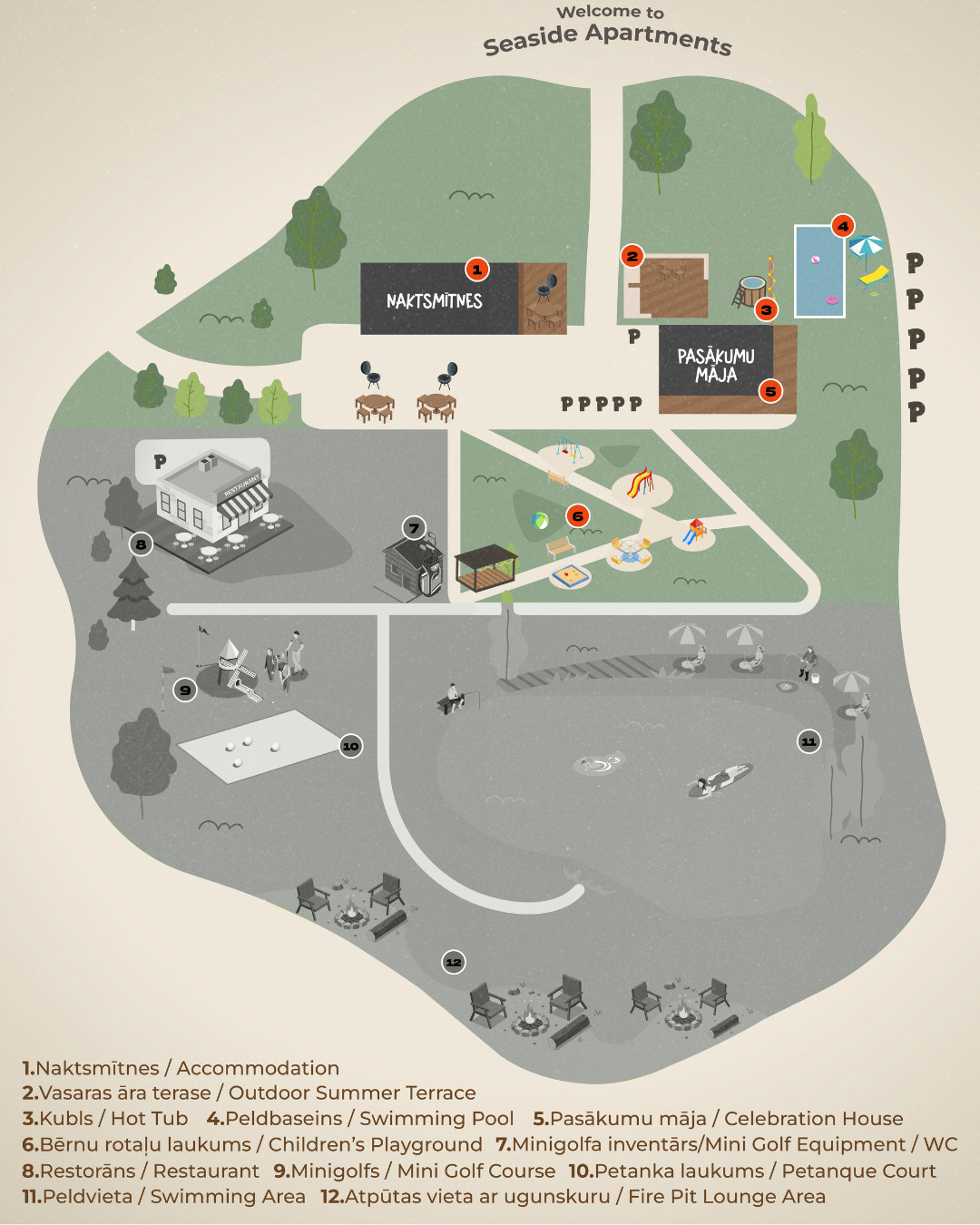 Комплекс расположен всего в нескольких минутах от моря и предлагает спокойную, ухоженную атмосферу, где можно приятно провести время с семьёй, друзьями или коллегами.